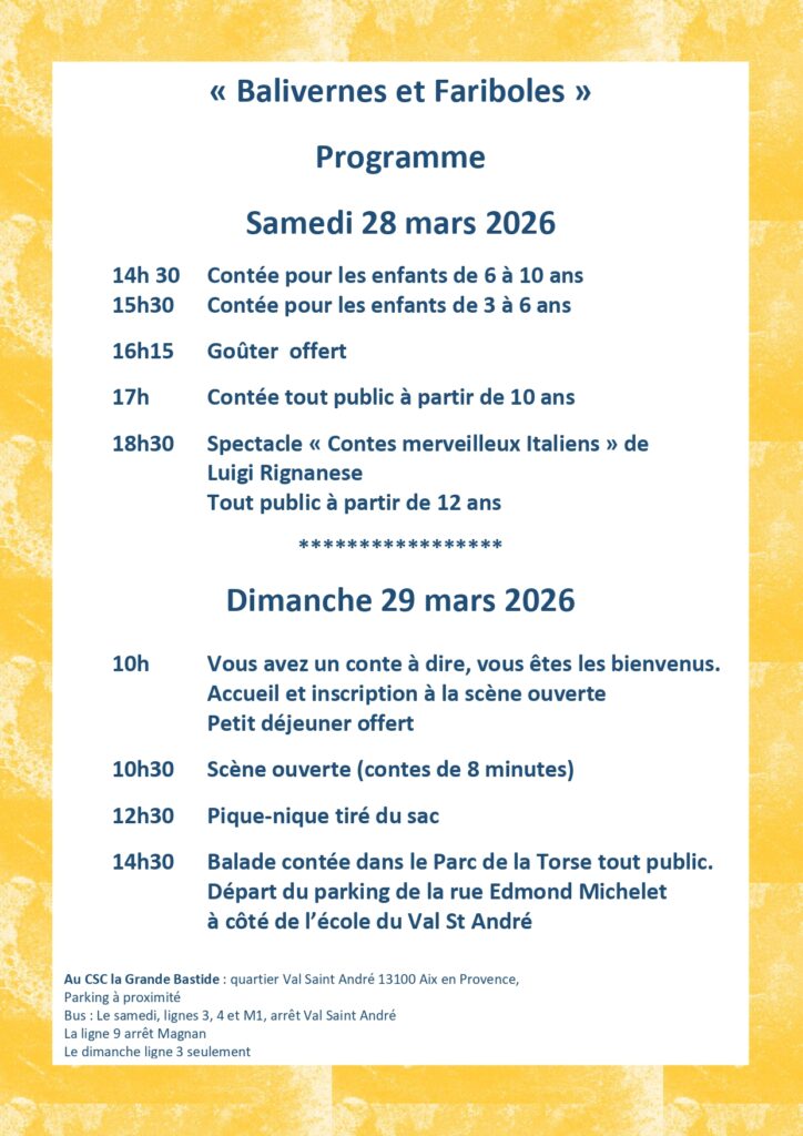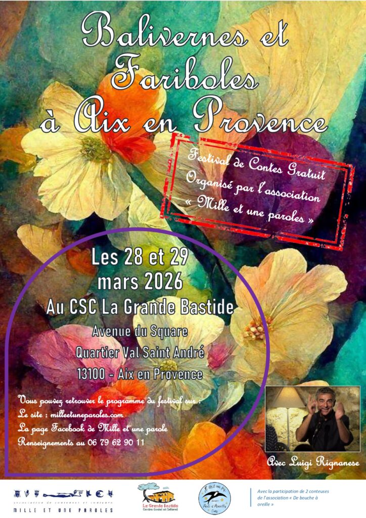 Le festival de contes « Balivernes et fariboles », proposé par l’association « Mille et une paroles » Paroles, revient les 28 et 29 mars 2026 au Centre Social et Culturel La Grande Bastide à Aix-en-Provence. Cet événement gratuit invite petits et grands à plonger dans l’univers du conte tout au long du week-end. Le samedi 28 mars, des contées pour enfants de 3 à 10 ans seront proposées dès l’après-midi, suivies d’un goûter offert, d’une contée tout public et d’un spectacle de Luigi Rignanese, « Contes merveilleux italiens », à partir de 12 ans. Le dimanche 29 mars, la matinée sera consacrée à une scène ouverte pour celles et ceux qui souhaitent partager un conte, autour d’un petit-déjeuner offert, avant un pique-nique tiré du sac. Le festival se clôturera par une balade contée dans le Parc de la Torse, ouverte à tous, avec départ depuis le parking de la rue Edmond Michelet, à côté de l’école du Val Saint-André.