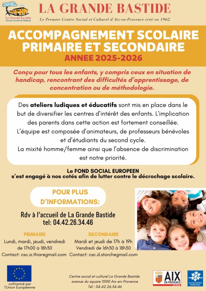 L‘accompagnement à la scolarité est à la recherche de bénévoles pour l’accompagnement scolaires des groupes de primaires et collèges. Si vous êtes intéressés pour venir aider et accompagner les enfants et les jeunes dans leur apprentissage, n’hésitez pas à nous contacter au 04.42.26.34.46 (accueil du centre social et culturel)