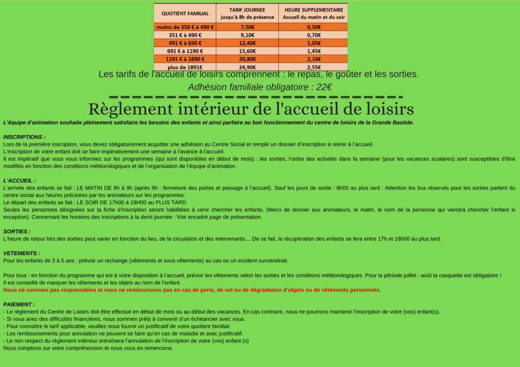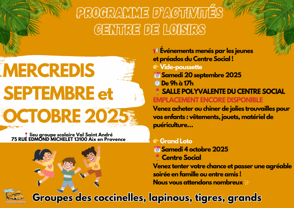 📞 Pour tout renseignement supplémentaire concernant l’accueil de loisirs, vous pouvez contacter la directrice du centre de loisirs Alexia Galmim par mail à csc.a.galmim@gmail.com ou l’accueil du Centre par téléphone au 04.42.26.34.46 ou par mail à csc.contactgrandebastide@gmail.com !