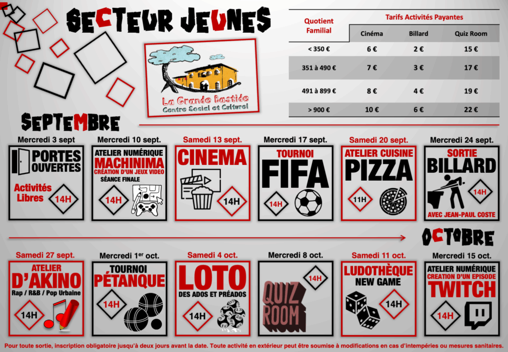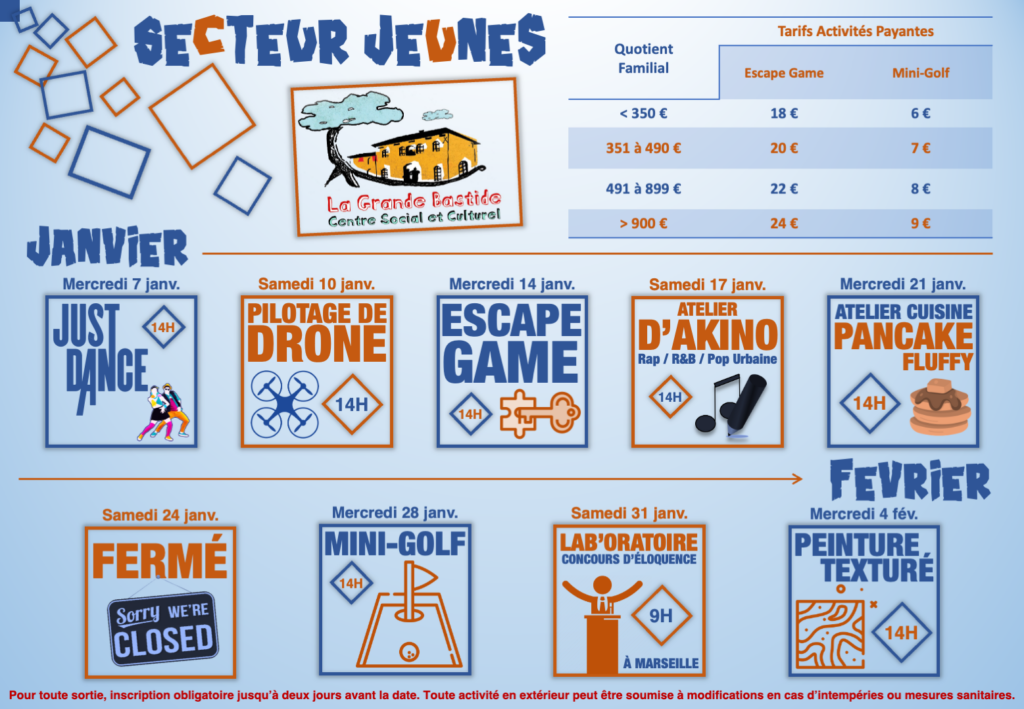 📞 Pour plus de renseignement concernant les activités du Secteur Jeunes ou l’accompagnement scolaire, contactez l’animateur Dorian par mail à l’adresse csc.d.storch@gmail.com ou l’accueil du Centre au 04.42.26.34.46.
