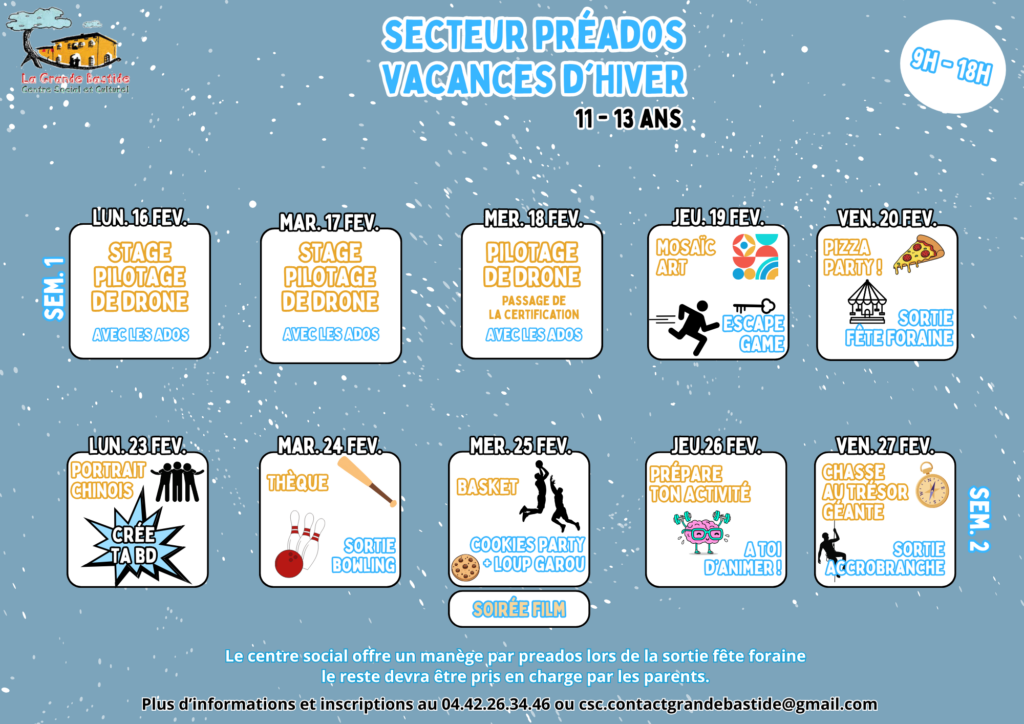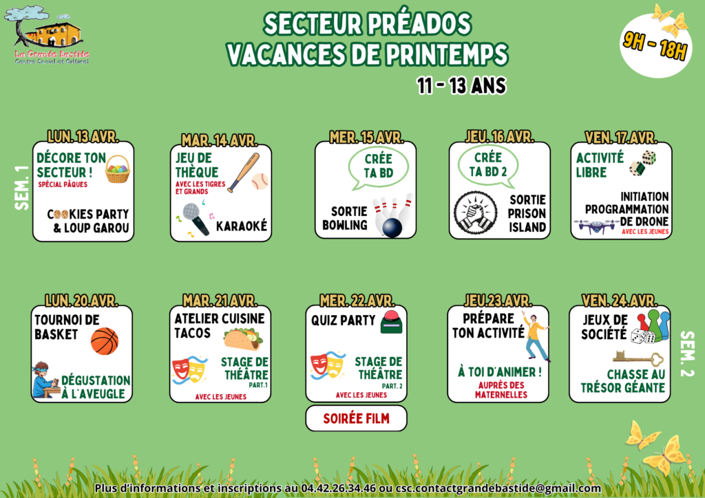 📞 Pour tout renseignement supplémentaire concernant le secteurs préados, vous pouvez contacter la directrice du centre de loisirs Alexia Galmim par mail à csc.a.galmim@gmail.com, l’animatrice référente Sarah Leyoudec à csc.s.leyoudec@gmail.com ou bien l’accueil du Centre par téléphone au 04.42.26.34.46.